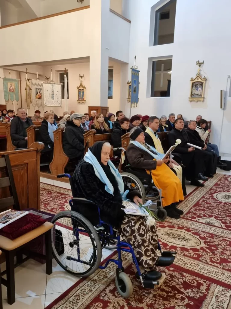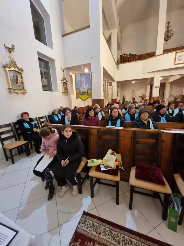 După recitarea solemnă a Rozariului de bucurie, întegrată între nelipsitele cântări mariane, adevărate îmnuri de laudă a Preacuratei Fecioare Maria, s-a făcut primirea celor șase noi membrii, doamnele Nuța, Irina, Lenuța, Maria, Elisabeta, respectiv tânărul David. Cei șase candidați au fost găsiți vrednici de a fi primiți între fii și fiicele alese ale Preacuratei Fecioare Maria. Ei s-au alăturat prin rugăciune, cu inima deschisă și sufletul curat, celorlalte marianiste din această parohie.